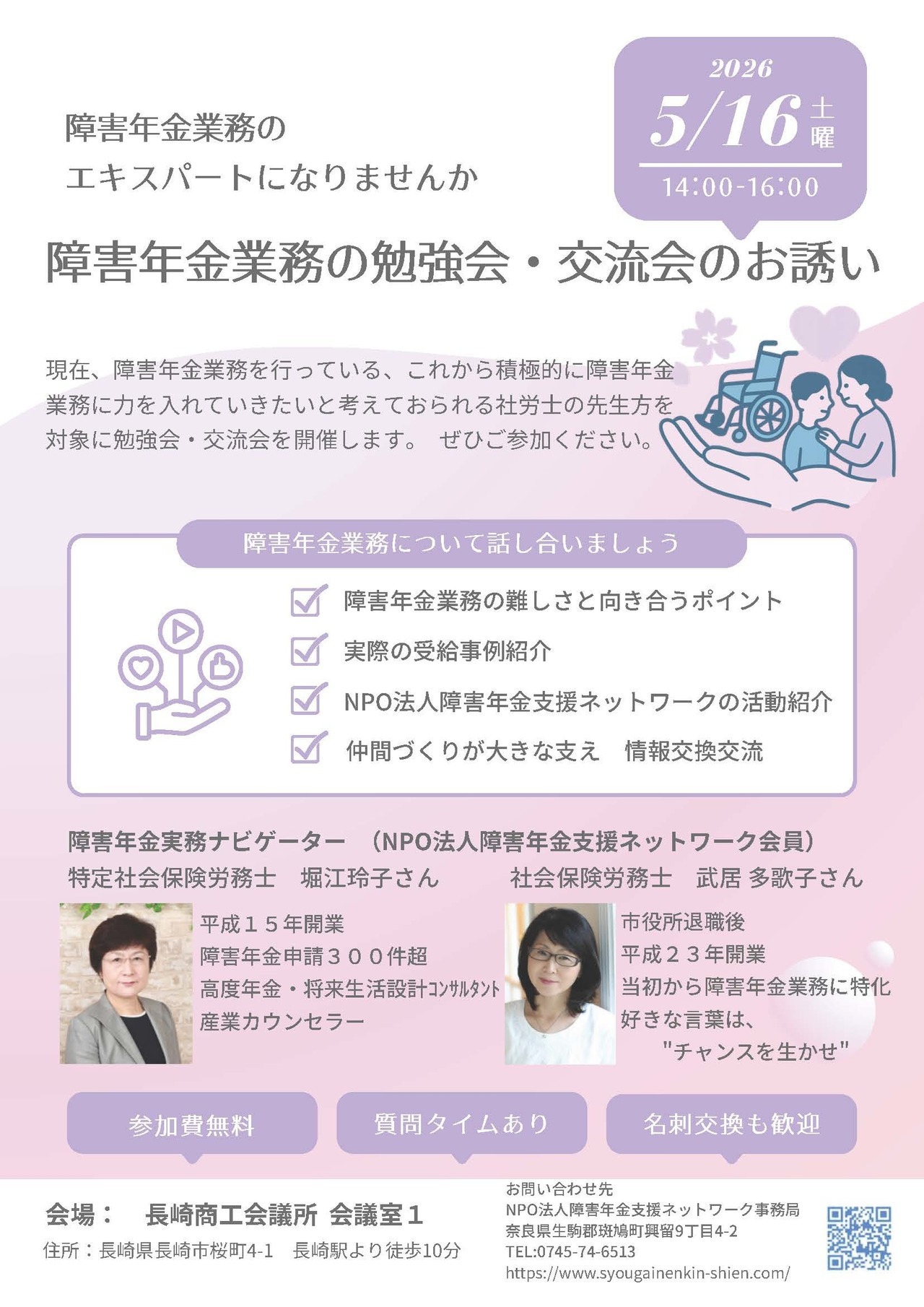 5月16日(土)14時から長崎商工会議所で障害年金業務の勉強会・交流会を開催いたします。障害年金業務に長く携わっている障害年金支援ネットワーク会員の堀江玲子さん、武居多歌子さんとともに勉強会・交流会を開催します。