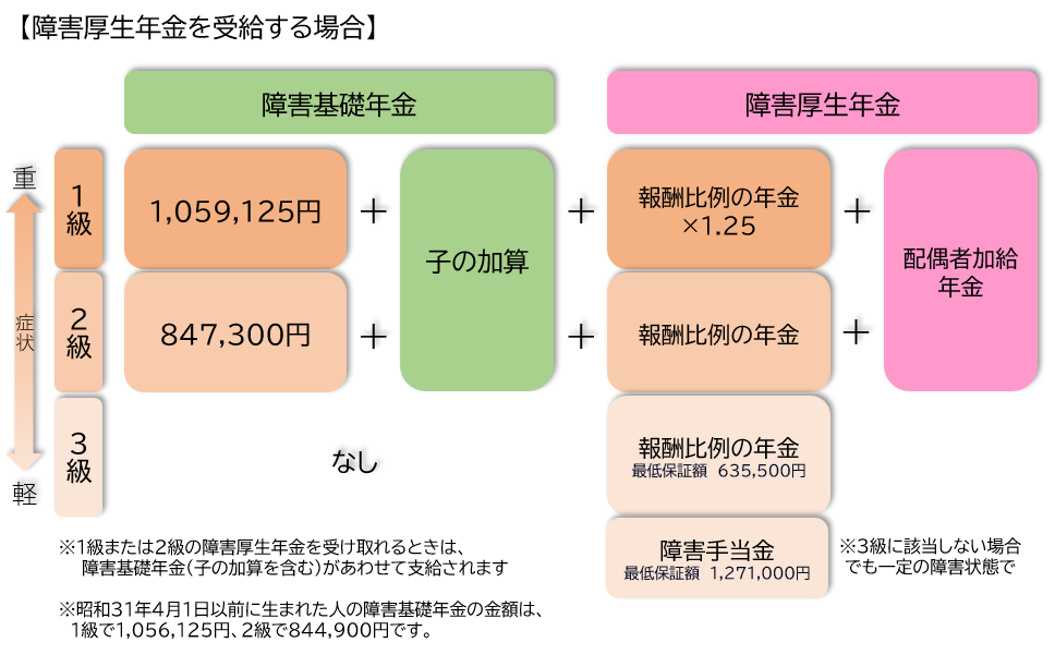 | 1級 | 障害基礎年金(1,059,125 円+子の加算) + 報酬比例の年金×1.25+配偶者加給年金 |